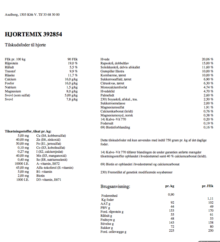 I kraftfoderet har jeg altid givet et ekstra tilskud af vitaminer og mineraler i form af DLG’s Micro Suplex, som drysses over kraftfoderet. Om Micro Suplex har en positiv effekt på opsatsen eller andet hos råvildtet, er der endnu ikke ført bevis for, men jeg er overbevist om den gode effekt, ligesom det er ganske uskadeligt for råvildtet. Hvis jeg i dag skulle bestille mere DLG Hjortemix 392854, ville jeg bestille det med Micro Suplex iblandet i pillerne, samt få fjernet den lille del biotin, som er i foderet i dag. Biotin er tilsat for at forstærke klovene hos råvildtet, men da der ikke tidligere har været de store problemer med klovene, men efterfølgende derimod flere dyr med snabelsko, ville jeg forsøge at køre med foderet uden biotin i et par år og så vurdere, om det har hjulpet på snabelskoene.
